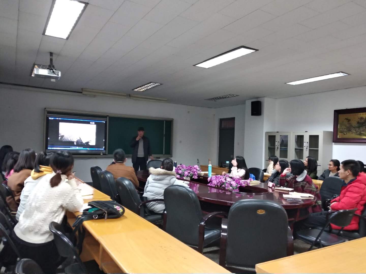 2018年11月22日,yl7703永利集团官网硕士导师王苏生在12号楼5层会议室作“电影是什么”的学术讲座,文艺学专业的硕士研究生听取报告并进行了交流。