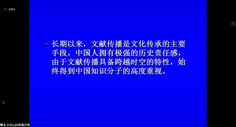 5月29日晚上,yl7703永利集团官网特邀请中国传媒大学传播研究院王京山教授开展了以“历史视野中的文献传播考察”为主题的线上讲座。