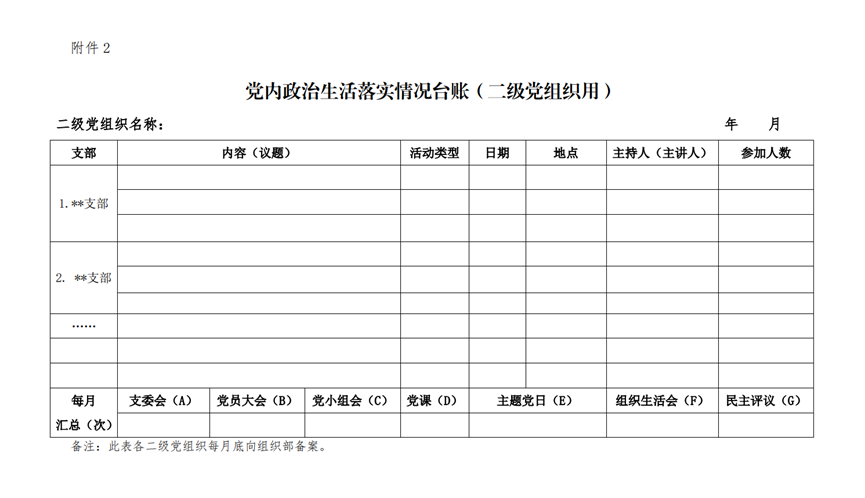 每月底,各党支部填写“备案表(支部用)”(附件 1),向二级党组织备案;二级党组织根据所辖党支部备案表内容,建立“党内政治生活落实情况台账(二级党组织用)”(附件 2)并向党委组织部备案。
