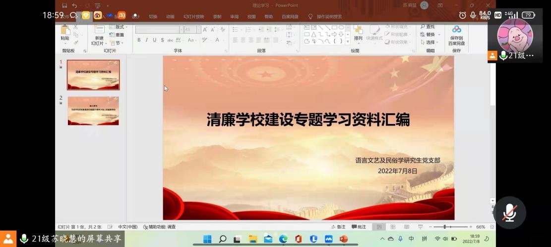 7月8日下午19点,语言文艺及民俗学研究生党支部在线上召开会议,深入学习《清廉学校建设专题学习资料汇编》。本次会议由苏晓慧主持,全体党员参加。