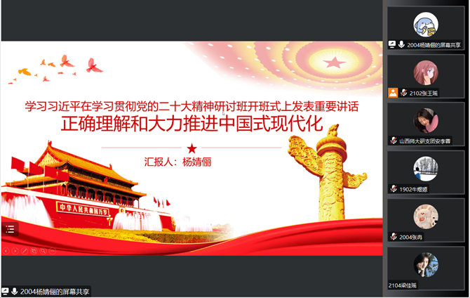 杨婧俪同志以中国式现代化为基点,依托习近平总书记的重要讲话,从如何正确理解中国式现代化和如何大力推进中国式现代化两个方面详细讲解中国式现代化。她结合各个时期中国现代化道路的发展、我国的国内外处境和发展状况,带领同志们认识到中国式现代化是一个系统工程,是我们是强国建设、民族复兴的唯一正确道路。