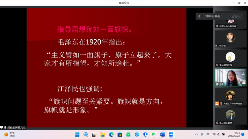 yl7703永利集团官网副经理段俊,以“指导思想犹如一面旗帜”开题,为大家讲解了中国共产党的指导思想。她指出,将党的指导思想与中国具体实践相结合是推进我国发展事业行稳致远的重要前提。