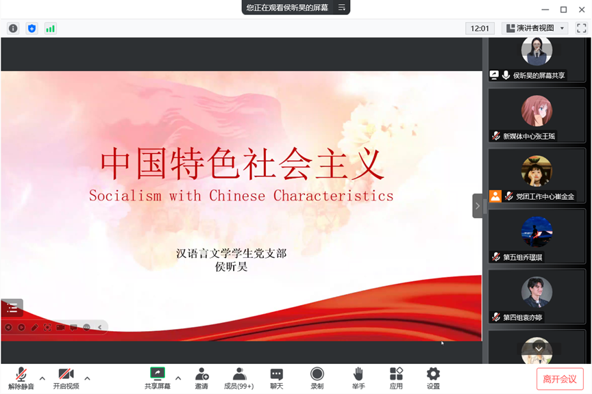 汉语言文学员工党支部书记侯昕昊从伟大历史转折和中国特色社会主义的开创、把中国特色社会主义推向21世纪、在新形势下坚持和发展中国特色社会主义、中国特色社会主义进入新时代四个方面对中国特色社会主义的专题进行讲解。