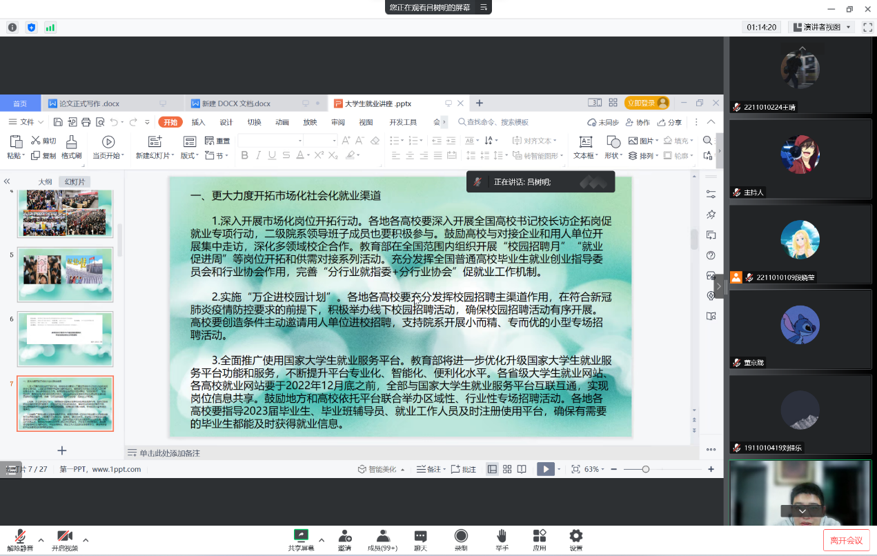 会议伊始,吕树明老师带领大家详细解读了教育部发布的《关于做好2023届全国普通高校毕业生就业创业工作的通知》,他强调当前疫情形势严峻,就业情况不容乐观,同学们一定要确立正确就业观念,不断提高自身综合实力。他以2020届和2021届毕业生毕业去向为切入点向同学们讲解了yl7703永利集团官网就业形势,让同学们更加清晰地了解就业形势,并就如何树立正确的择业观提出相关建议。最后,吕老师指出同学们要对就业大环境有清晰的认知和理解,正确认识自我、确立职业理想、科学规划职业,保持积极乐观的就业心态,转变陈旧的择业观念,结合社会的需要理性就业、勇敢创业。