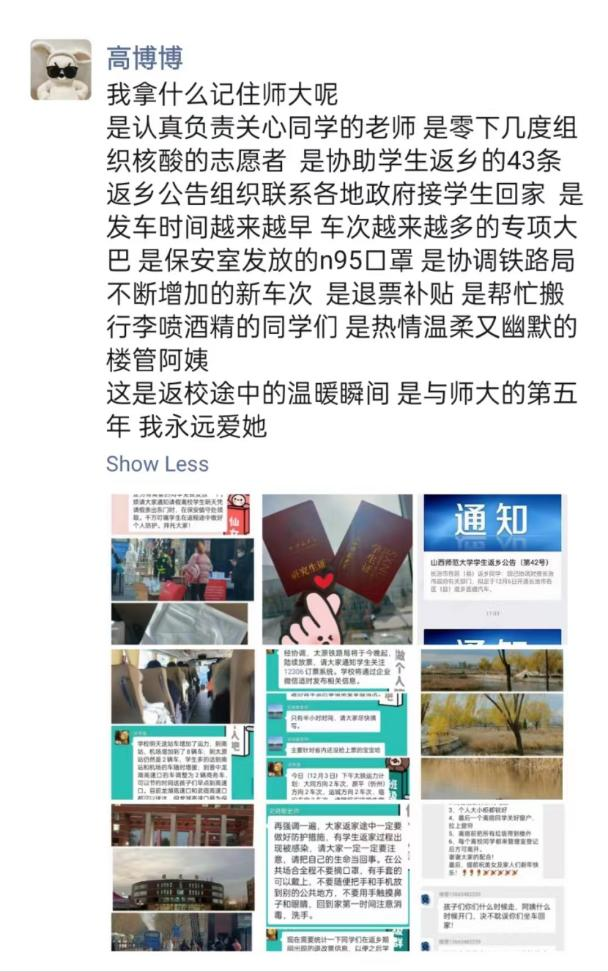,保护每位学子的生命安全和身体健康,学校开始着手有序安排员工按批次提前返乡。从进一步优化离校审批手续、组织安排“点对点”送返乡离校同学至动车站点和机场、短短四天内加班加点协助员工返家的43条公告、到学校暖心为每一位离校学子发放N95口罩……师大有条不紊的实际行动在寒冬中温暖着每一位归家学子之心,为表达对学校的感激之情,语言文艺及民俗学研究生党支部开展了“我给学校的一封信”活动,以纯朴的文字向学校表达深深的爱。