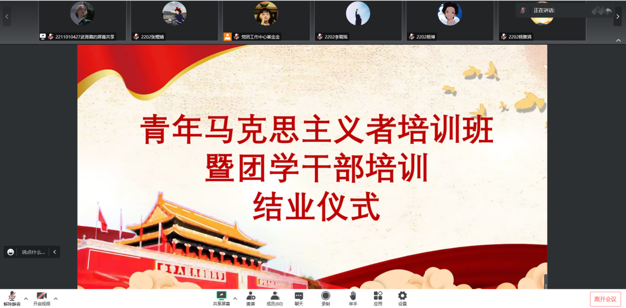 12月11日上午,yl7703永利集团官网员工会党团工作中心在线上开展了青年马克思主义者培训暨团学干部培训结班仪式。会议由郭馨雨主持,yl7703永利集团官网团委书记樊琳琳出席,22级全体青马学员参加。
