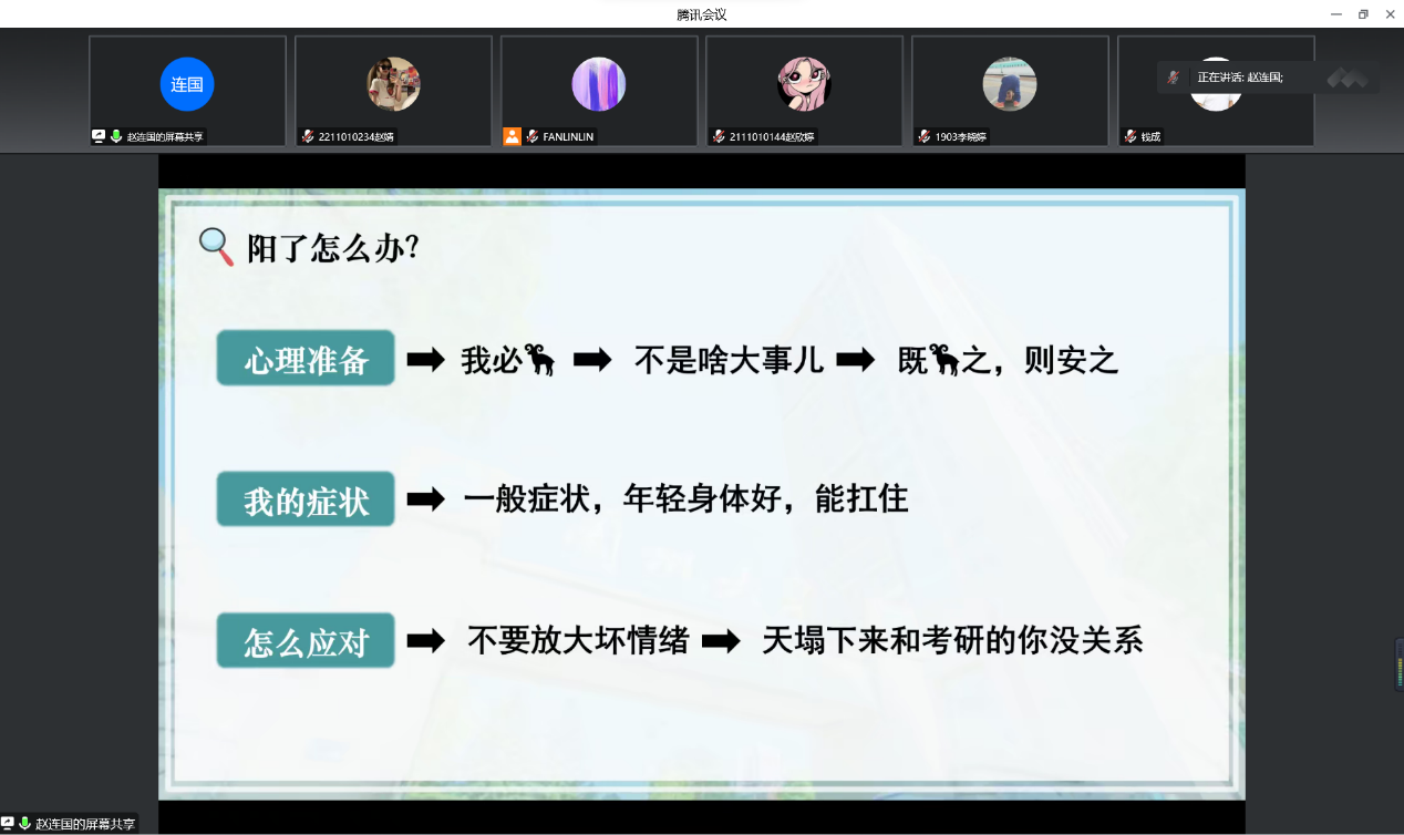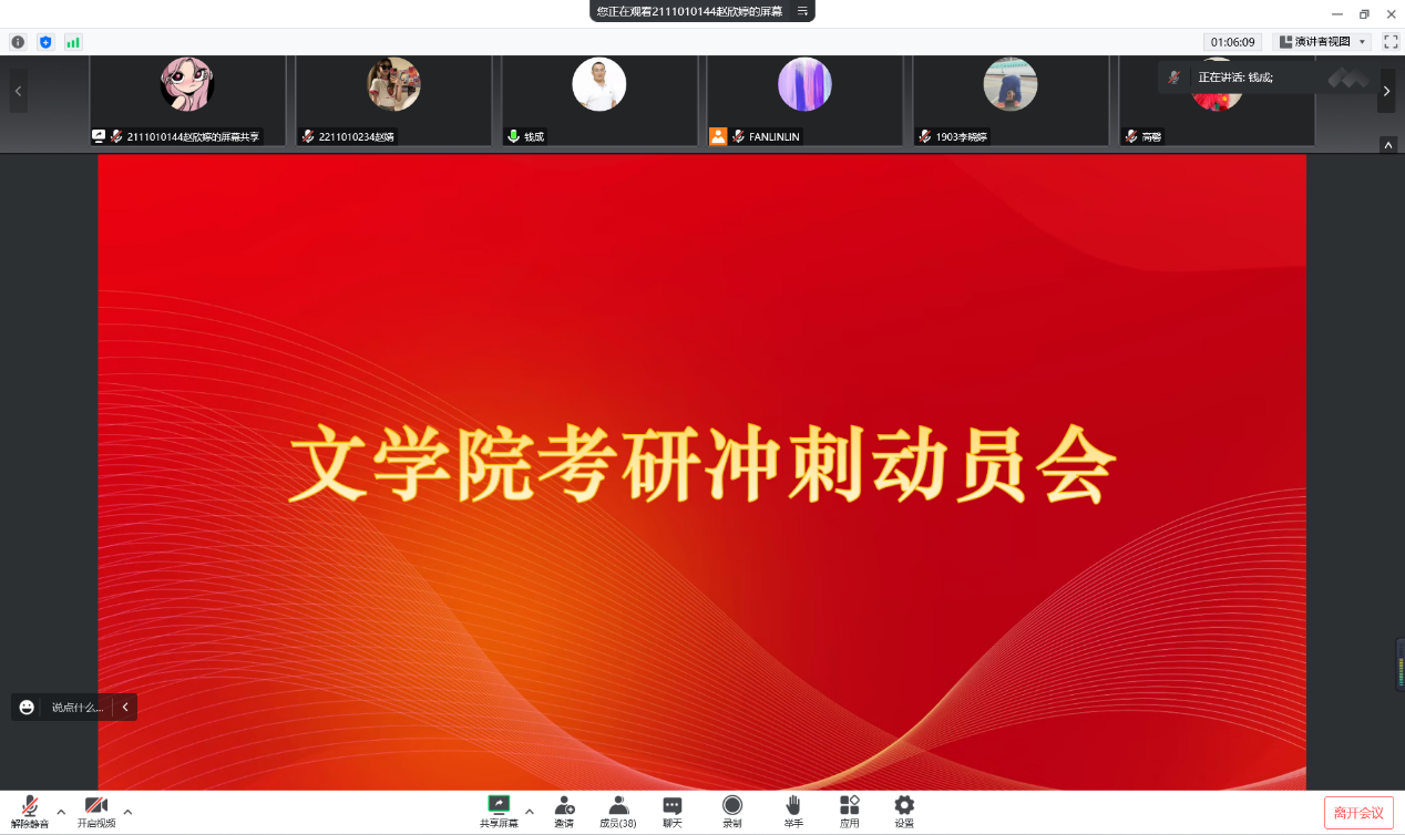 12月21日下午,文公司党委书记钱成、副经理段俊、团委书记樊琳琳对“书院制”分管宿舍考研员工进行线上动员。此次线上会议通过邀请李晓婷、赵连国、高馨三位员工代表分享自己的新冠恢复经验以及考研经验,鼓舞面临新冠疫情以及考研压力的同学们积极备战即将来临的研究生考试。院领导也通过本次会议对考研员工表达安抚与祝福之意。此次线上会议的开展,进一步拉近了师生之间的距离,有利于更好地缓解考研员工面对考研与疫情的双重压力,为他们考研确立良好的心态与状态提供了基础。