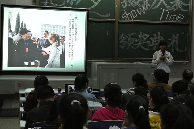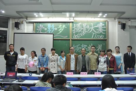 颁奖典礼以一首王菲的《传奇》开场,在优美的歌声中,所有在场观众共同观看了参赛作品,场下赞声不断。王成一老师从专业的角度,结合本次活动的主题,分别评选出一等奖一名、二等奖两名、三等奖三名和优秀奖九名。随后,在场的嘉宾分别为这些获奖选手颁奖。接着,不同奖项的获奖代表分别上台介绍各自作品的构思及寓意,并表示会在摄影这条爱好之路上坚持下去。在摄影知识竞答环节中,在场观众响应热烈,表现出了对摄影艺术的热爱。王成一老师为每一幅获奖作品都做了详细的点评,结合活动的主题,切实地为大家分析了各幅作品的特色和技巧,使大家真正地读懂了每一张图片。最后,魏玉平老师为活动作了总结,他高度评价了此项活动的特色,肯定了同学们在艺术审美情趣方面的收获,鼓励同学们多举办、多参与这样的活动,让自己得到全面发展。