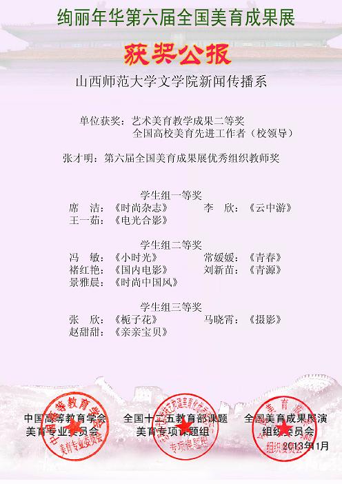 近日,yl7703永利集团官网新闻传播系及师生在“绚丽年华全国美育成果展”中,以出色的集体组织成效与整体专业水平、优异的专业作品在竞争异常激烈的国家级美育成果大赛中,脱颖而出,斩获佳绩。yl7703永利集团官网新闻传播系及师生分别荣获集体与多项个人奖。其中:yl7703永利集团官网新闻传播系荣获“艺术美育教学成果二等奖”;张才明老师荣获“第六届全国美育成果展优秀组织教师奖”;席洁(1004班)、李欣(1006班)、王一茹(1006班)三位同学荣获员工组一等奖;冯敏(1004班)、常媛媛(1004班)、褚红艳(1004班)、刘新苗(1006班)、景雅晨(1006班)等五位同学荣获员工组二等奖;张欣(1006班)、马晓霄(1004班)、赵甜甜(1006班)等三位同学荣获员工组三等奖,为山西师大、为yl7703永利集团官网争得了荣誉。这次参赛与获奖,既是对公司新闻传播系编辑出版学专业多年办学水平的一次考核与检验,也是公开与国内众多知名高校同场竞技、相互学习的一次机会,同时,也向全国高校、全社会展示了公司不俗的办学实力与良好形象。