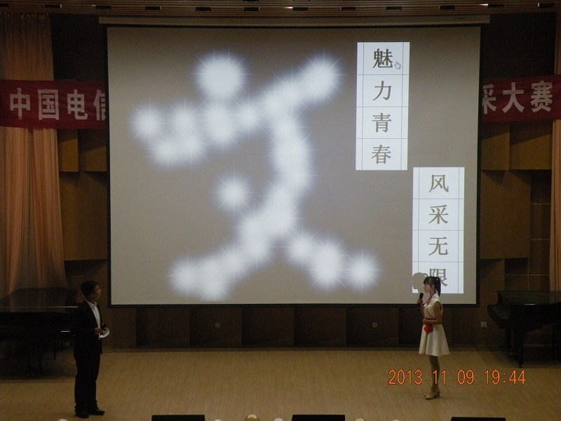 晚7点,师大音乐厅灯火辉煌,主持人宣布礼仪风采大赛正式开始。比赛共分为自我介绍、知书答礼、服装T台秀、个人才艺展示4个环节。礼仪部全体成员进行开场舞表演后,八位参赛选手以幻灯片为辅助分别作了自我介绍,并进入“知书答礼”环节,依次进行自主选题做答,此环节旨在考察她们对于基本文明礼仪知识的掌握程度。在个人才艺展示环节,八位选手分别进行了她们的才艺表演。她们的节目,形式多样,表演精彩,获得观众的阵阵欢呼与喝彩。“服装T台秀”是此次大赛的一大亮点,选手们身着各种风格的礼服,伴随音乐在台上尽情展现自己的风采,她们的精彩表现再次引发了热烈的掌声。大赛还特别设置了现场抽取幸运观众环节,每个抽奖环节都有三位幸运观众获得师大电信提供的礼品,有效的增强了与观众的互动,活跃了现场气氛。此外,比赛过程中还穿插了外联部的精彩小品《新闻联播之外联特写》,以及电信营业厅选送的员工个人演唱《两地曲》、迈克尔杰克逊的激情舞蹈等节目。