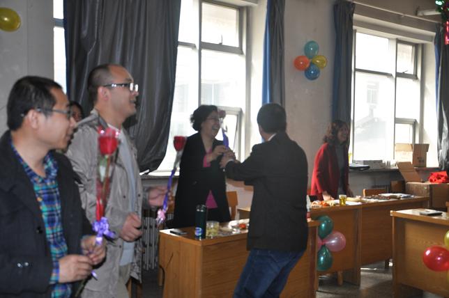 接下来,本次联谊联欢会的第一个亮点出现了:送人玫瑰手有余香。男教工纷纷起立,每人手捧一只鲜花站立成一圈,在延保全经理的带领下,集体为女教工献上了怒放的玫瑰花,令在座的女教工一个个笑靥如花。这个精心设计的别开生面的小环节,体现了yl7703永利集团官网尊重和关爱妇女的良好风尚,一下子就把将联欢会推向了高潮,手捧玫瑰花的女老师们全将舒心与开怀写在了脸上。
