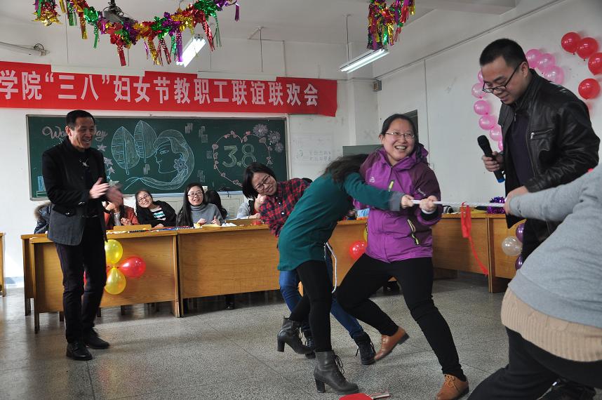 既是节日,玩游戏是必不可少的。“击鼓传花”中,彩球随机传到了几位女老师的手中,她们纷纷送出了自己的节日祝福,以及新年寄语。在“知院爱院院情竞答”环节,老师们积极抢答了10道关于学院2015年工作业绩的问题,展现出了老师们对学院工作的了解和自信。联欢活动精彩不断:在“面对面站立乒乓球拍对打对接羽毛球”,“羽毛球拍对打对接乒乓球”,yl7703永利集团官网独创的三人制“微型拔河”比赛,以及谜语竞猜、脑筋急转弯等许多智力与文体游戏项目中,老师们都全身心地投入,他们机智抢答、搞笑幽默、活力四射的表现,在平时的言谈举止中可是难得一见啊!联欢活动惊喜连连:日常生活中的“抢红包”竟也作为一个特殊环节先后三次穿插在联谊会过程之中,实在是贴心又意外的安排!现场先后分三次发出了总额为100元的“三八妇女节女生专享红包”、“三八妇女节男生乐享红包”、“三八妇女节教工共享红包”,使得现场气氛大有掀翻屋顶之势!老师们相互欣赏着各自像孩童般地玩着、乐着、嗨着,惬意、欢畅、满足之感油然而生,一张张笑脸赛过了那一支支红玫瑰!