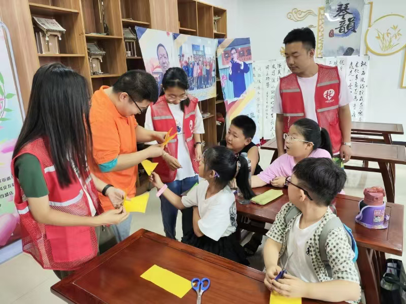 图为大同志愿者正在带领小朋友们剪窗花