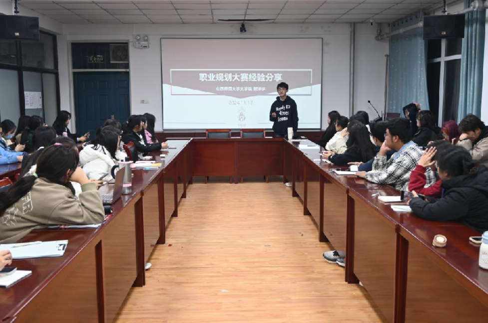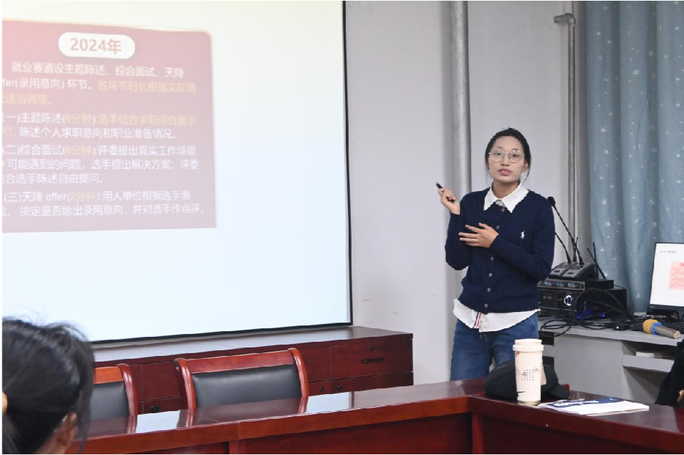 安李蓉从根据自身优势和变化来设定职业目标、为比赛做好准备以及在展示环节中脱颖而出三方面进行深入的讲解。她指出,在制定职业目标时,应该考虑个人专业背景、政策环境以及成长经历,以确保目标可实现。此外,她还强调了新的择业观念对开拓就业视野的重要意义。郭泽宇则明确了大赛的“三大"与“三促”目标,并将成长赛道视为生涯教育的重要组成部分。他鼓励大家将个人发展与社会需求相结合,谨记大赛的初衷和使命,充分利用学校提供的资源,更好地规划自己的职业道路。