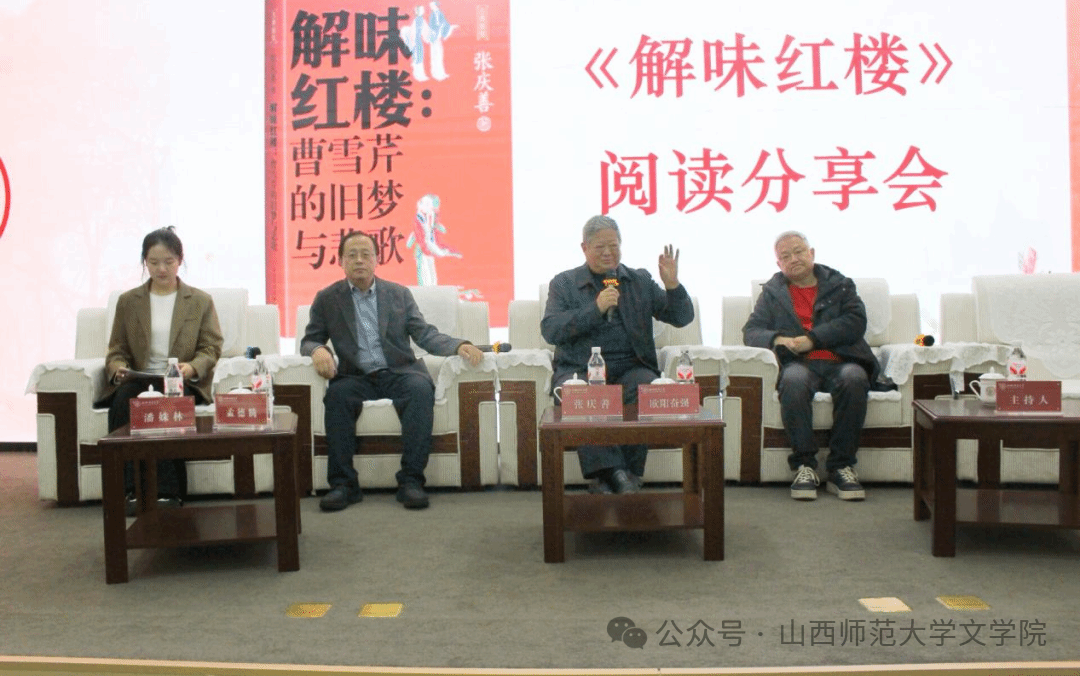 分享会上,张庆善从创作目的、写作风格对个人红学研究著作《解味红楼:曹雪芹的旧梦与悲歌》进行解读,欧阳奋强盛赞其人格魅力与作品的“烟火气”,提出文学思想阅读的重要性。孟德腾肯定了著作的严密论证与学术性,25级研究生潘姝林结合书中内容分享了阅读感悟。分享结束后,现场展开热烈研讨,进一步深化了对经典的理解与思考。