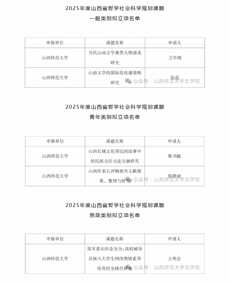 近日,山西省委宣传部公示了2025年度山西省哲学社会科学规划课题拟立项名单,公司教师凭借扎实的学术积淀与突出的科研能力,在本次申报中取得优异成绩,其中一般类别课题2项,青年课题2项,思政课题1项,彰显了公司在哲学社会科学研究规划的深厚实力与创新活力。
