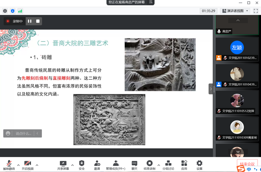 高忠严老师从走进山西古村落、山西古村落建筑、山西古村落组织、古村落公益与乡规民约、古村落与民间艺术五个角度出发,结合实景图片详细解读了山西古村落的分布地域、形成历史、保存现状及其当今意义。除此之外,高忠严老师还具体介绍了“晋商大院三雕艺术的制作方式与文化内涵”、“社文化”、“接姑姑迎娘娘”等一系列地域文化,鼓励同学们为保护和传承传统文化贡献出自己的力量。